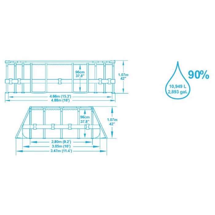 La ligne de piscines Power Steel Frame de Bestway propose des bassins de forme ronde, rectangulaire ou ovale jusqu’à 7,32 m de longueur ou 5,49 m de diamètre pour une profondeur variant de 100 à 132 cm. Ici profitez d’une piscine ovale de 4,88 m de longueur, 3,05m de largeur et 1,07m de profondeur. Sa forme ovale permet d’avoir un bassin compact qui ne requiert que peu d’espace.