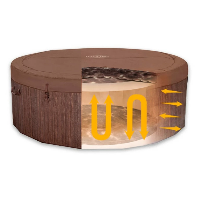 À l’intérieur, la structure en Thermacore permet également d’apporter une résistance hors-pair. Ce matériau est une mousse semi-rigide qui apporte robustesse et durabilité. On se rapproche du spa en dur et on obtient un objet haut de gamme dans son jardin. L’innovation que représente cette structure Thermacore se retrouve sur 2 points forts principaux :
